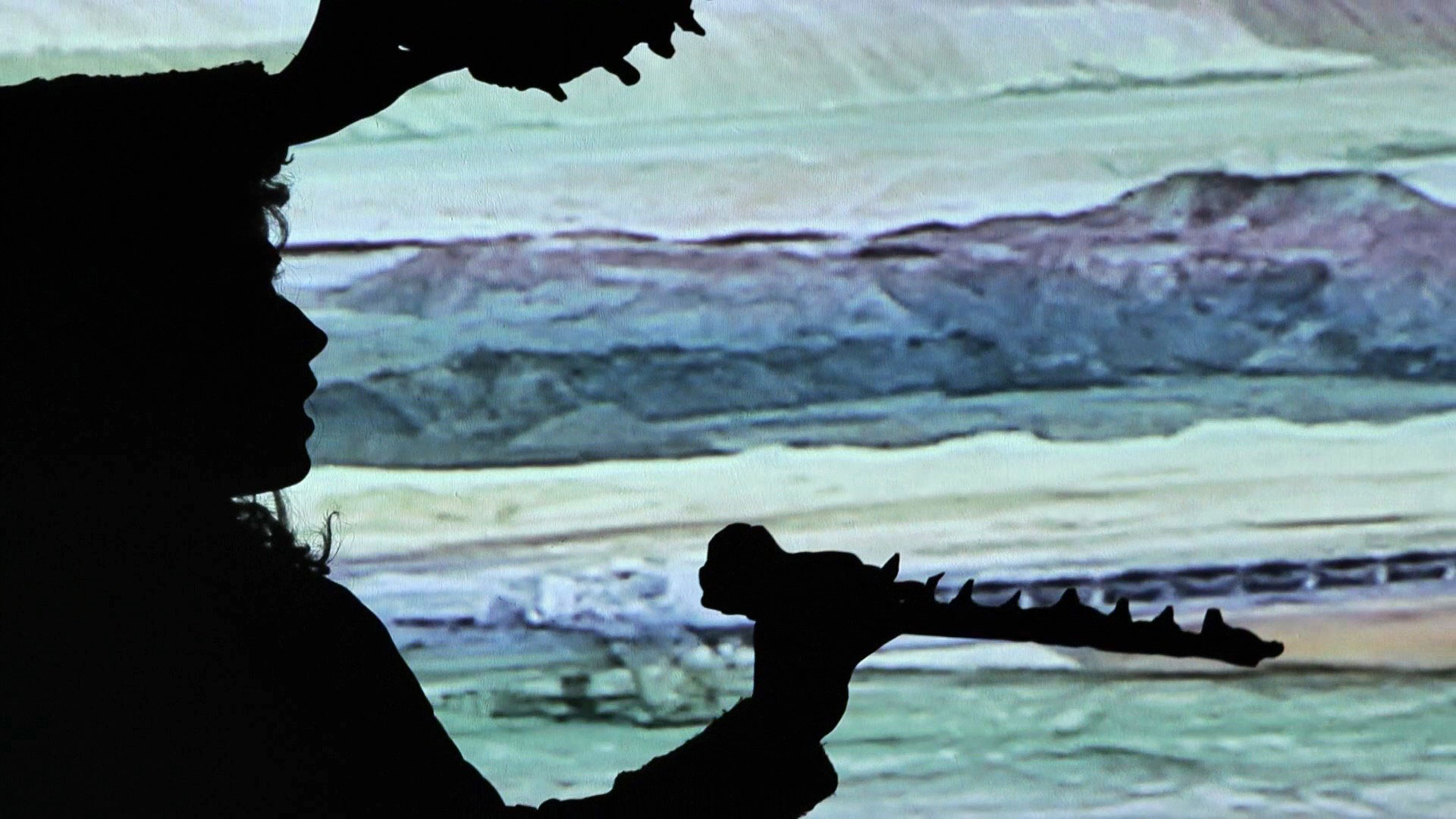 This is a story about the extinction of mosasaurs: a ritual performance reflecting on climate change, the utopia of reversing the entropy, death and rebirth. The artist merges her Anthropocene body into the Cretaceous Period, becoming a ruin of the future, eating and being eaten by the mining landscape.